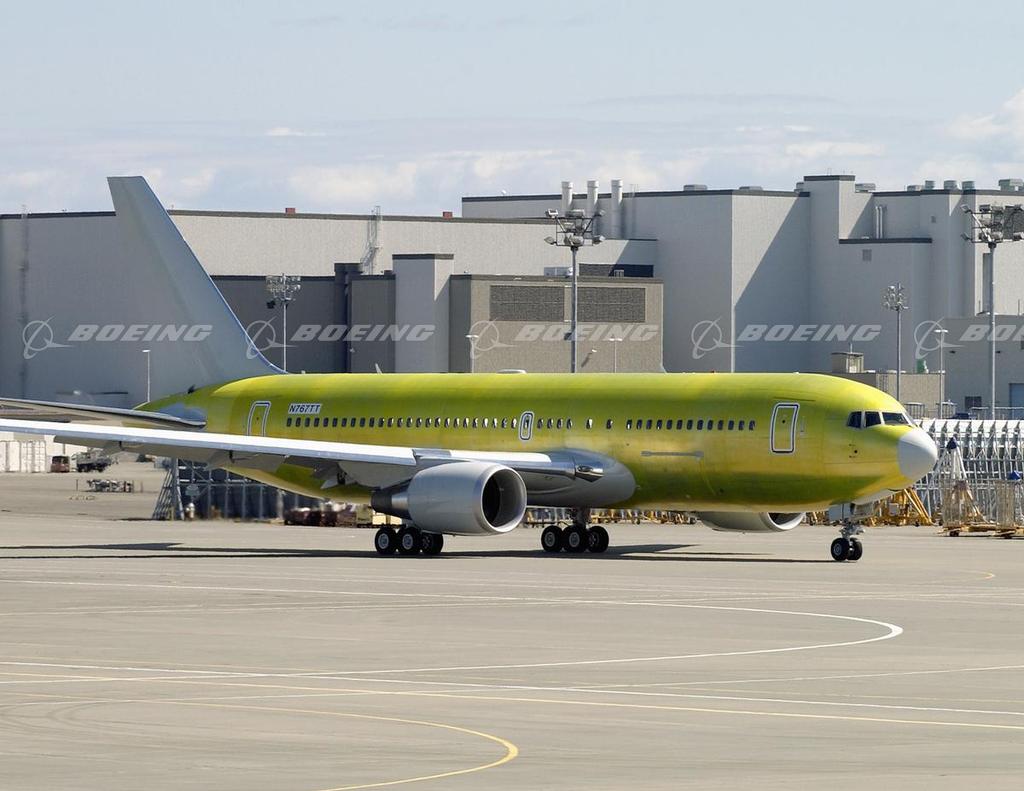 The first 767 Global Tanker prepares to depart Everett to undergo final modifications at Boeing's Wichita facility.