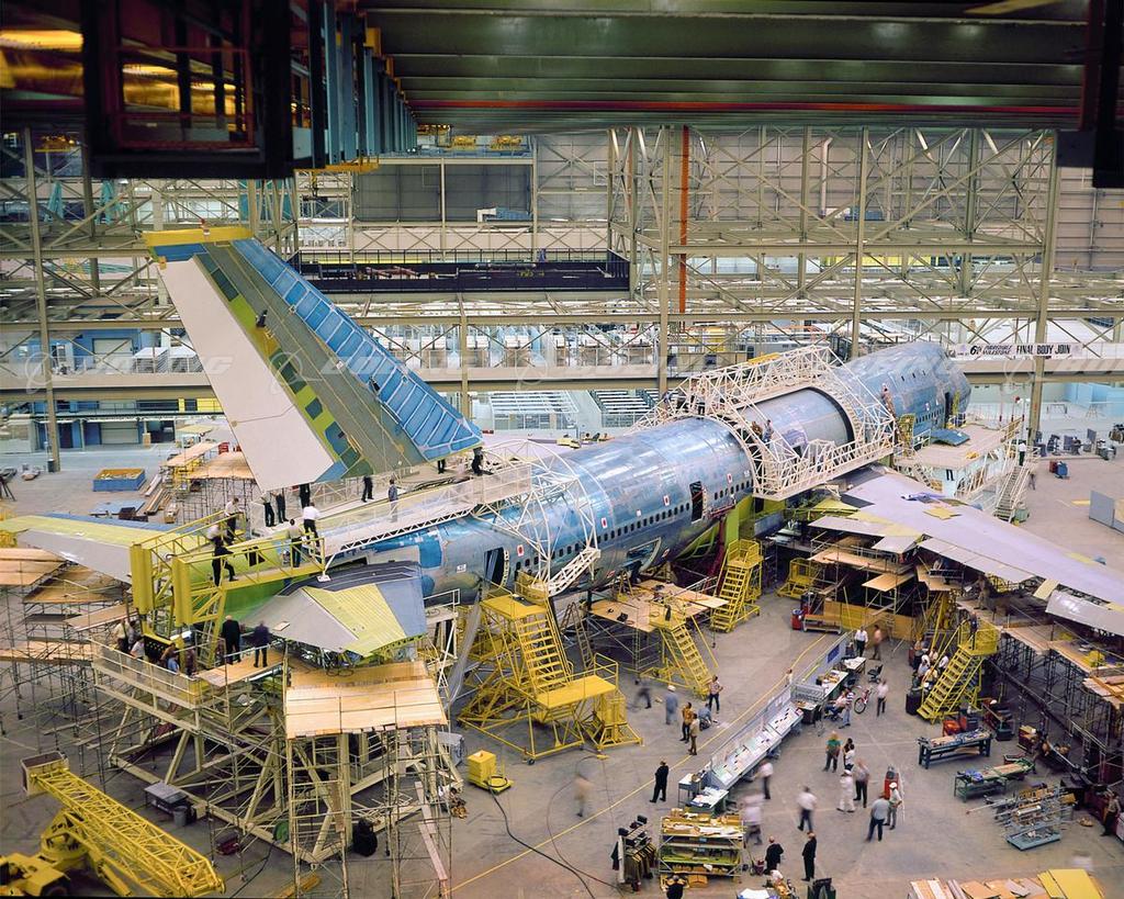 The 747 was truly monumental in size. The massive airplane required construction of the 200-million-cubic-foot 747 assembly plant in Everett, WA, the world's largest building (by volume). The fuselage of the original 747 was 225 feet long; the tail as tall as a six-story building. Pressurized, it carried a ton of air. The cargo hold had room for 3,400 pieces of baggage and could be unloaded in seven minutes. The total wing area was larger than a basketball court. Yet, the entire global navigation system weighed less than a modern laptop computer.