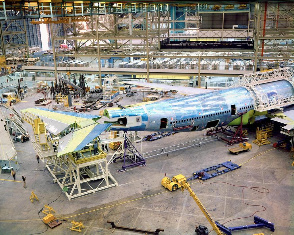 The 747 was truly monumental in size. The massive airplane required construction of the 200-million-cubic-foot 747 assembly plant in Everett, WA, the world's largest building (by volume). The fuselage of the original 747 was 225 feet long; the tail as tall as a six-story building. Pressurized, it carried a ton of air. The cargo hold had room for 3,400 pieces of baggage and could be unloaded in seven minutes. The total wing area was larger than a basketball court. Yet, the entire global navigation system weighed less than a modern laptop computer.