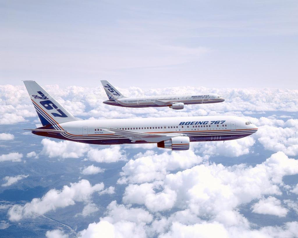 The 767, foreground, is shown with its sibling airplane, the 757. The planes were developed at the same time and are the only two Boeing commercial airplanes to offer flight deck joint certification.