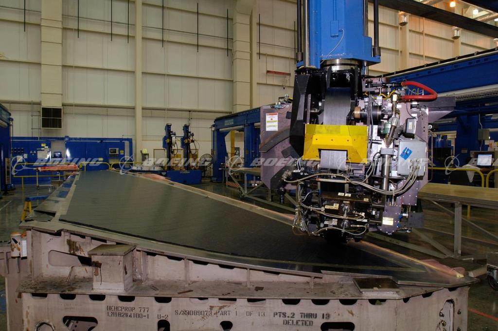 A robotic head assembly on an automatic tape lay-up machine is used to precisely lay carbon fiber ply layers on 777 vertical fin composite panels at the Boeing composites manufacturing facility in Frederickson, Washington.