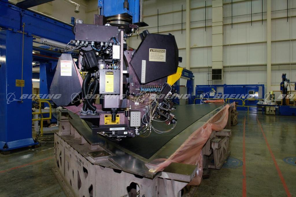 A robotic head assembly on an automatic tape lay-up machine is used to precisely lay carbon fiber ply layers on 777 vertical fin composite panels at the Boeing composites manufacturing facility in Frederickson, Washington.
