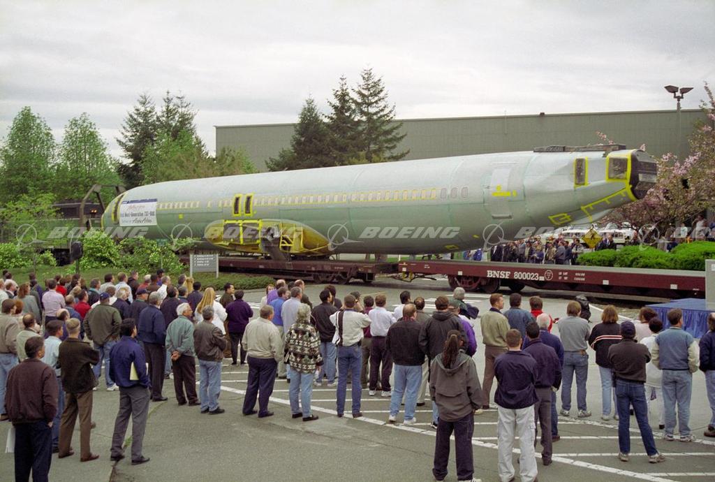 Employees of Boeing and Alaska Airlines welcome the first Boeing Next-Generation 737-900 fuselage as it arrives at the Boeing final assembly plant in Renton, Wash. The fuselage traveled 2000 miles by rail across the U.S from Wichita, Kan. Alaska Airlines is scheduled to take delivery of the first 737-900 in April 2001. Continental Airlines, KLM Royal Dutch Airlines and Korean Air Lines also have ordered the model.The Next-Generation 737 is the newest, most advanced commercial airplane family in its class.