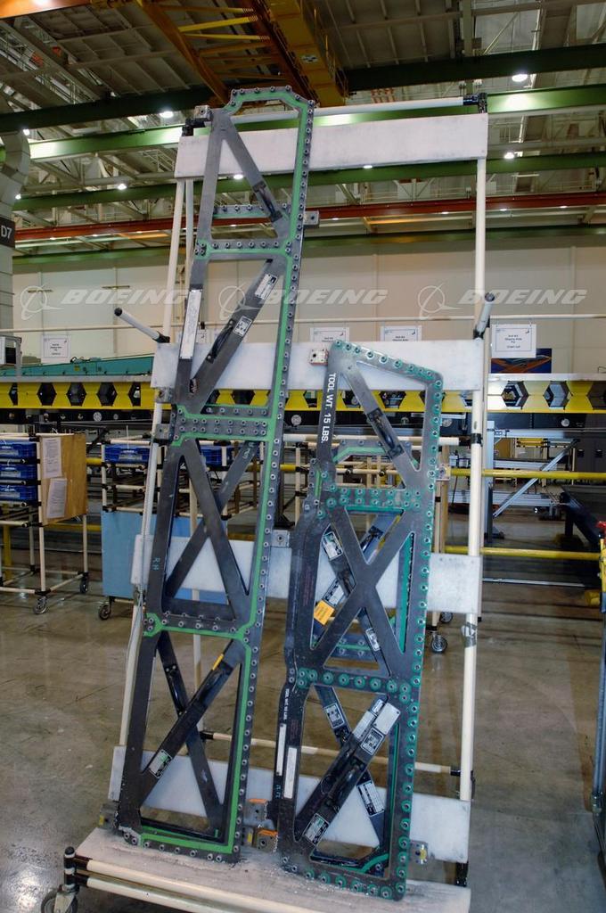 Composite parts for installation in a 777 vertical fin at the Boeing facility in Frederickson, Washington.