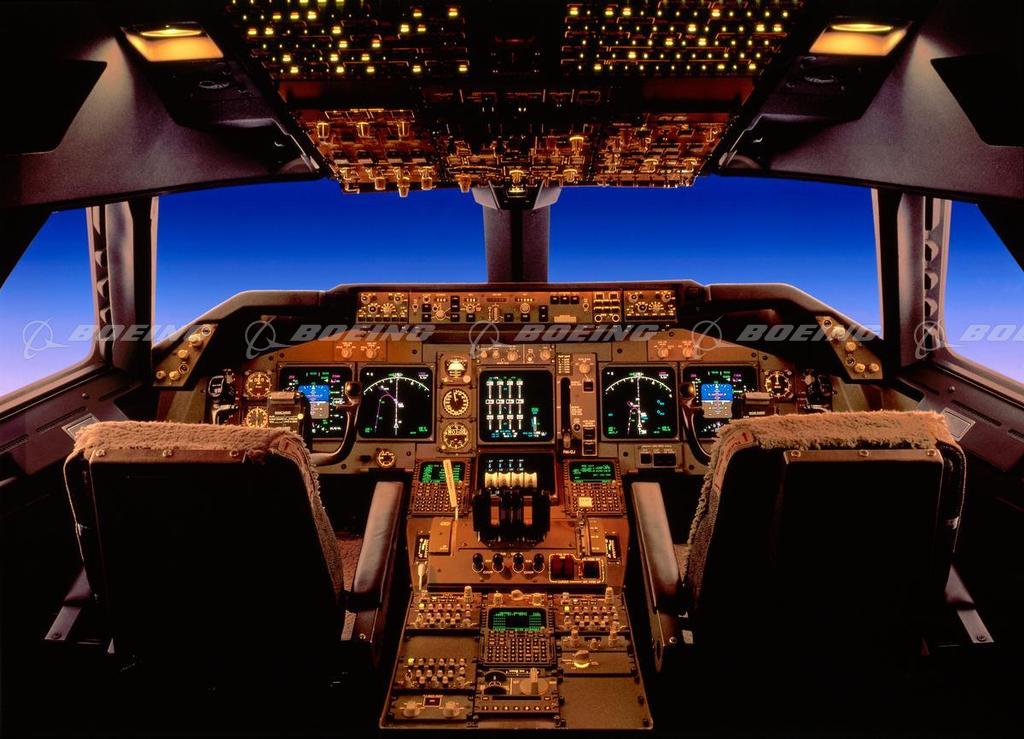 The large, bright integrated displays of the 747-400 digital flight deck reduce crew workload and enhance situational awareness.