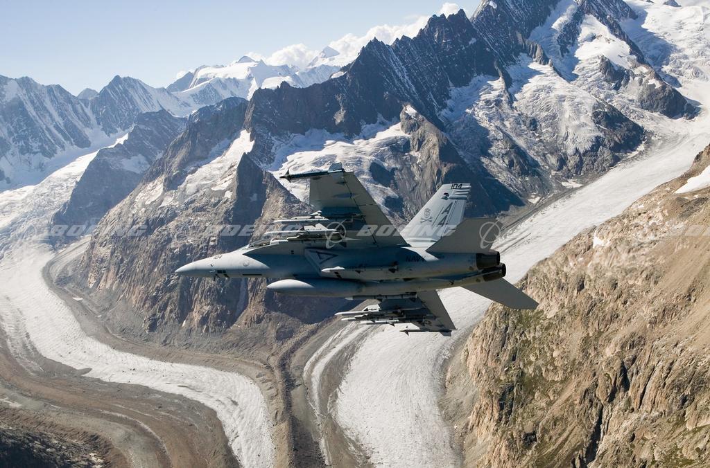F/A-18E/F Super Hornet in Flight over Swiss Alps