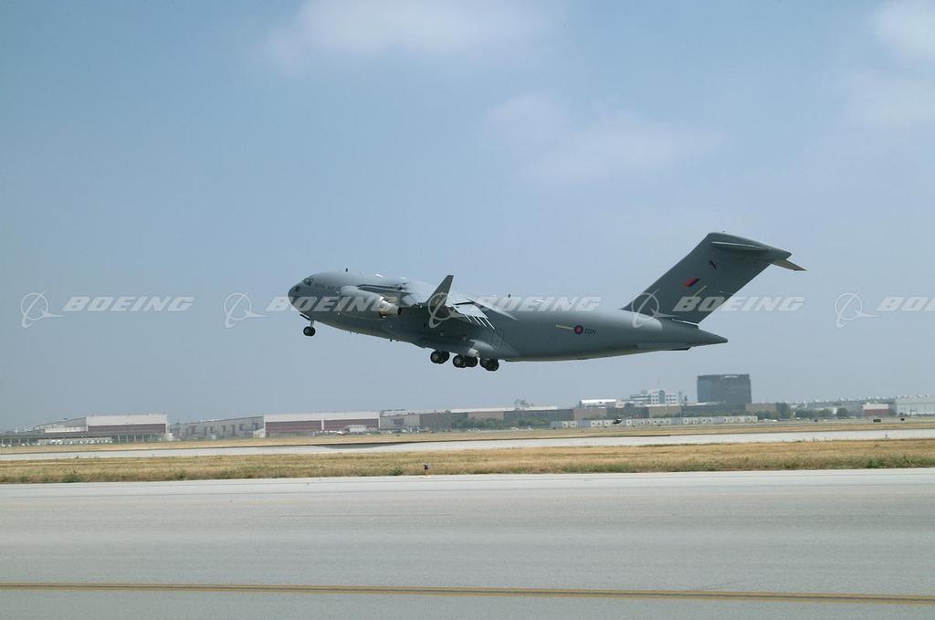 The first Boeing C-17 Globemaster III to be delivered to the United Kingdom Royal Air Force departs the Long Beach assembly facility on Thursday, May 17, 2001.