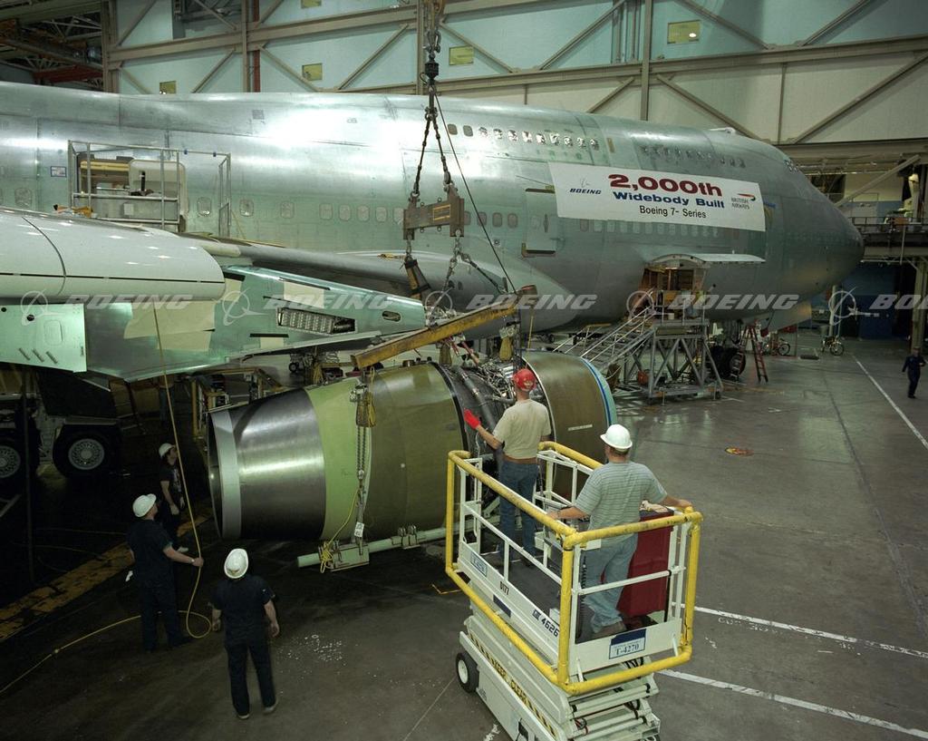 A Rolls-Royce engine is installed on the 2,000th Boeing-built 7-series wide-body - a 747-400. Boeing assembles all 7-series wide-body airplanes, including the 767 and 777, at its Everett, Wash., factory. More than 100 customers worldwide have ordered about 2,500 Boeing 7-series wide-body airplanes, of which nearly 1,970 have been delivered. Since the first 747 rolled out Sept. 30, 1968, the 747 worldwide fleet has logged 20 billion miles (32 billion kilometers) - enough to make 42,000 trips to the moon and back.
