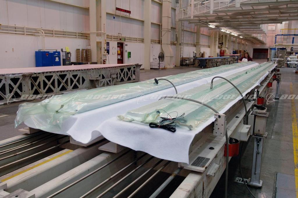 Carbon fiber composite beams are vacuum bagged in preparation for the curing process at the Boeing composites manufacturing facility in Frederickson, Washington.