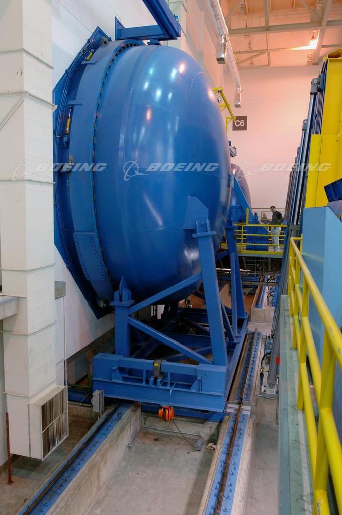 A huge custom-built door seals the autoclave for curing composite materials at the Boeing manufacturing facility in Frederickson, Washington.
