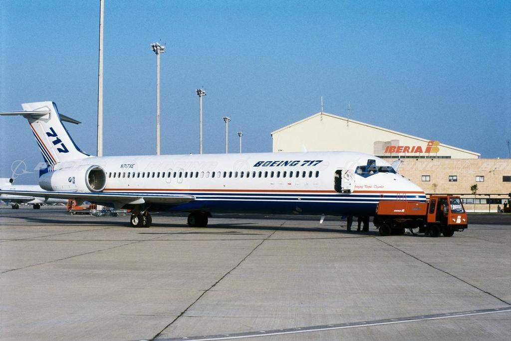 The 717 is a full-size twinjet designed specifically for the short-range, 100-seat regional airline market and is a very efficient and exceptionally quiet airplane. Its advanced technologies and rugged simplicity of design allow it quick turnaround time at a wide range of airports, so crew and passengers spend less time on the ground. It makes effective use of today's technology to lower operating costs, reduce noise and emissions, and provide big jet comfort. The airplane, formerly MD-95, was designated the Boeing 717 following the merger of McDonnell Douglas and The Boeing Company in 1997. In early 2005, after careful assessment of the challenging 100-seat market, Boeing announced that it will conclude 717 production in 2006 after delivering on current customer commitments.