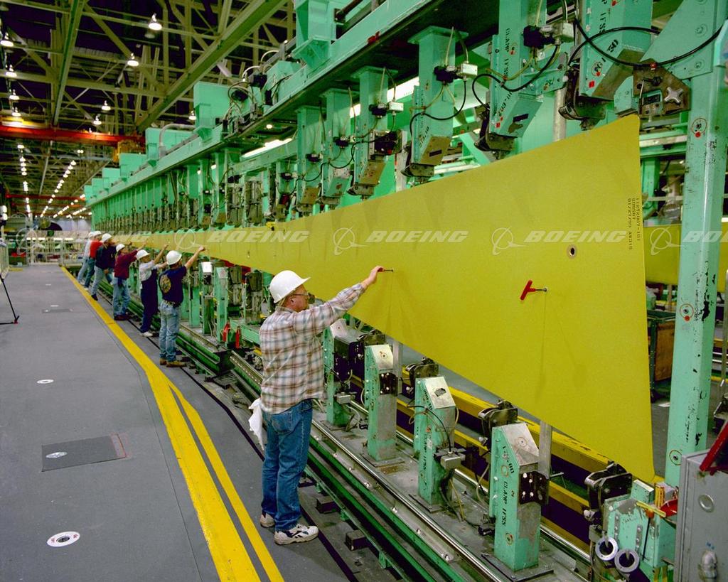 Wing mechanics and managers tighten pins that hold the first 767-400ER (extended range) wing spar in its tooling. An overhead crane in the Boeing factory in Everett, Wash. lowered the 82-foot spar and then guided it into the automated spar-assembly tool The first completed 767-400ER will roll out of the factory in about six months.