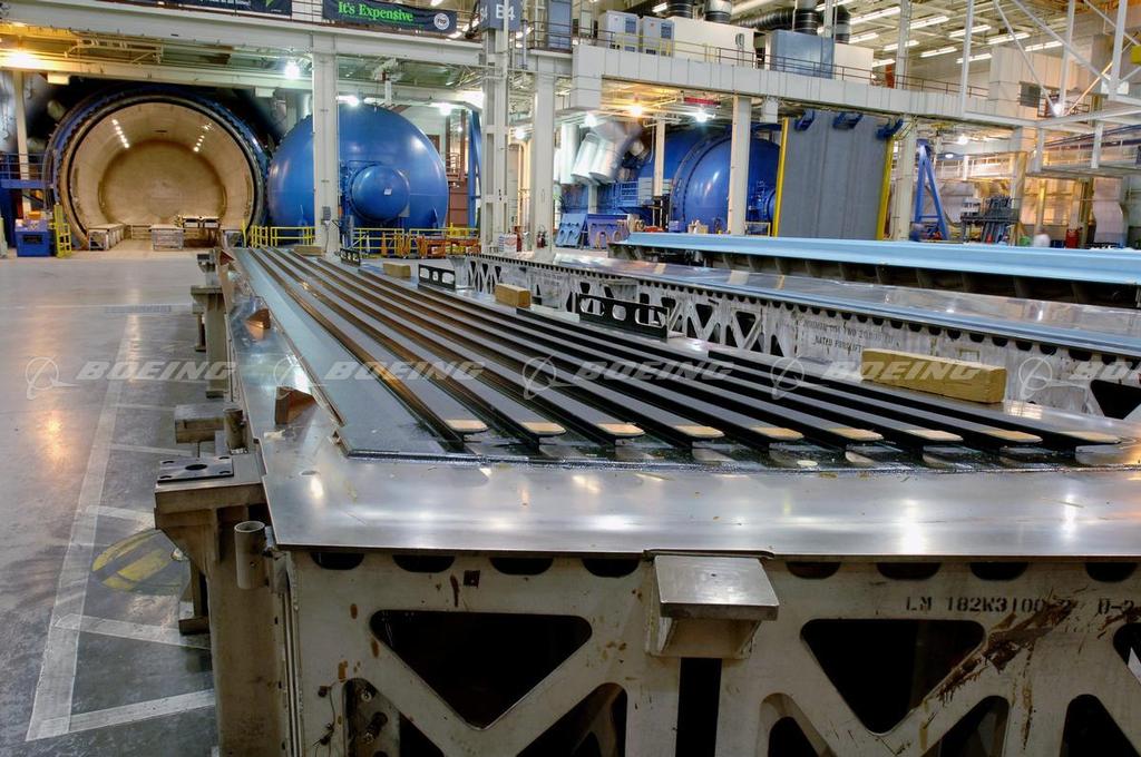 A cured composite part for a 777 vertical fin assembly has been removed from the autoclave after curing at the Boeing facility in Frederickson, Washington.