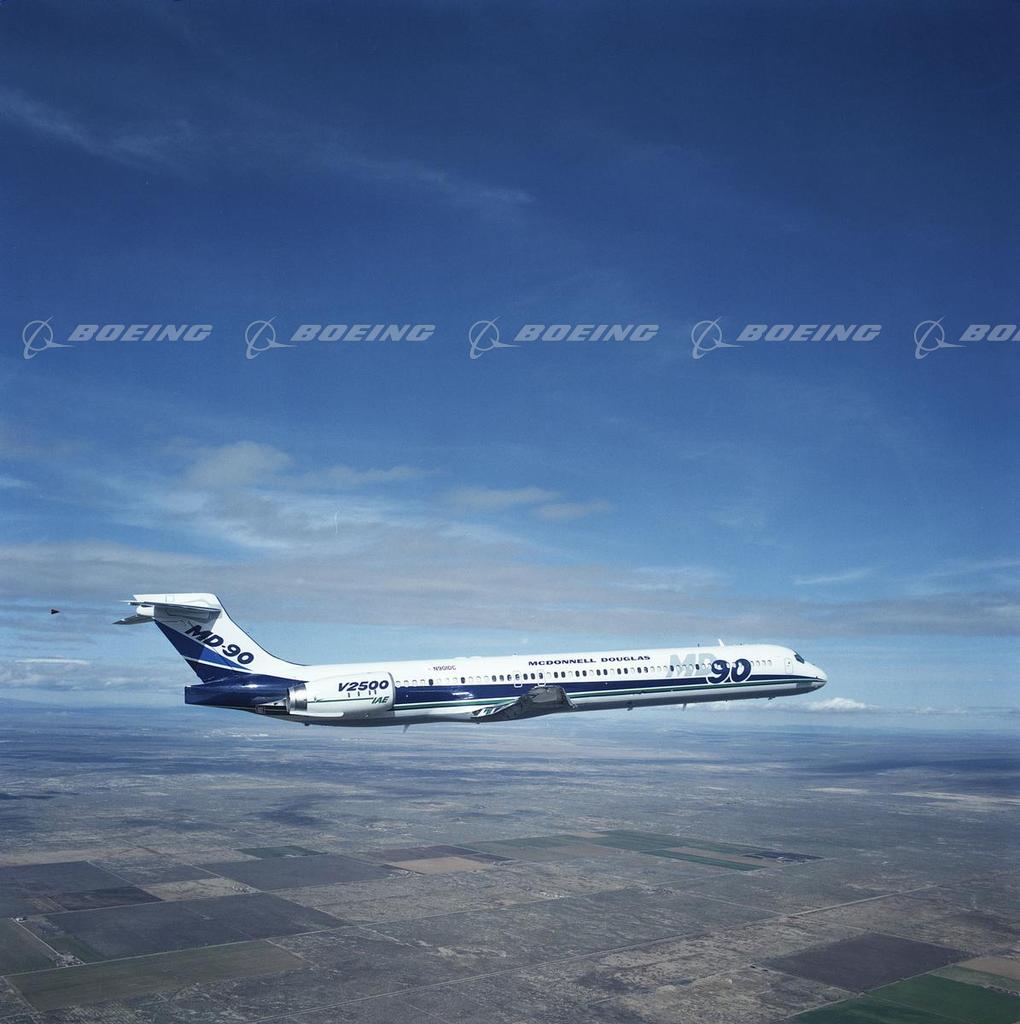 The MD-90 is powered by twin International Aero Engines (IAE) V2500 turbofans rated at 25,000-lb thrust each.
