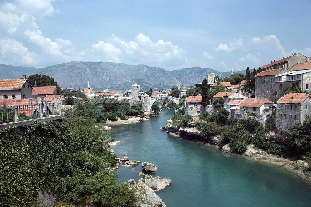 The Neretva river flows under the Mostar Bridge. The ancient bridge was destroyed during the Bosnian War in November 1993. However, a bridge reconstruction project was started in 1999 and was completed in 2004. The original bridge is shown here.