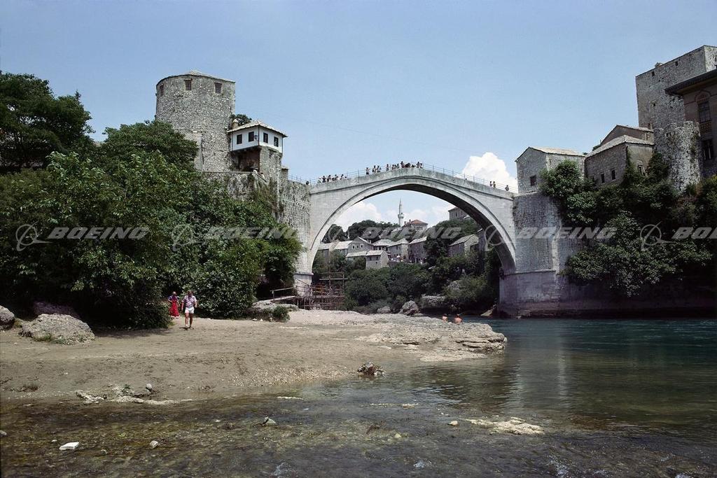 The Neretva river flows under the Mostar Bridge. The ancient bridge was destroyed during the Bosnian War in November 1993. However, a bridge reconstruction project was started in 1999 and was completed in 2004. The original bridge is shown here.