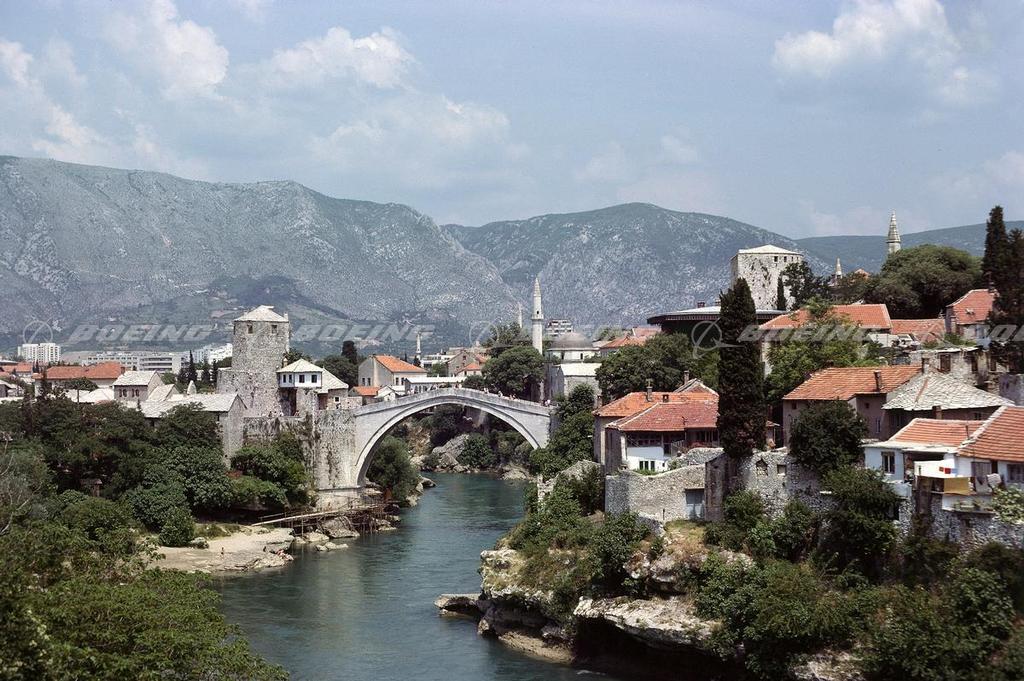 The Neretva river flows under the Mostar Bridge. The ancient bridge was destroyed during the Bosnian War in November 1993. However, a bridge reconstruction project was started in 1999 and was completed in 2004. The original bridge is shown here.