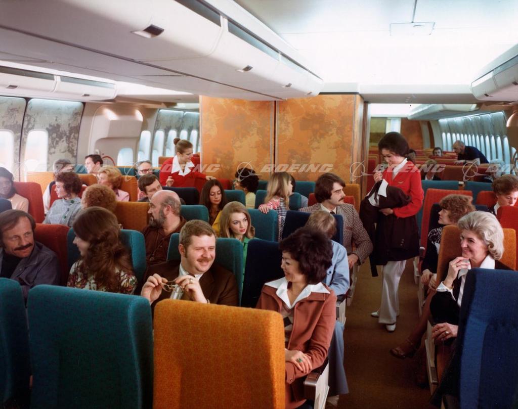 The full-scale interior mockup of the 747 at Boeing's Renton facility was modified to accomodate the 747SP program. The mockup was divided into four zones and decorated in bright, modern colors in the style of the 70s.