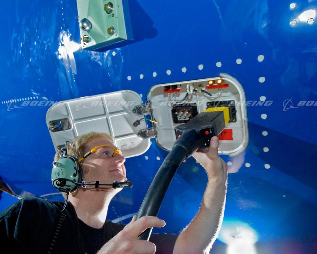 A Boeing test technician plugs an external power cart into the first 787 Dreamliner as part of the Power-On testing sequence. Testing lasted just over one week and demonstrated the distribution, conversion, control and consumption of electric power on board the airplane. Completion also verifies the accuracy of the installation of systems on the first 787 and is an important step toward preparing for first flight in 2008.