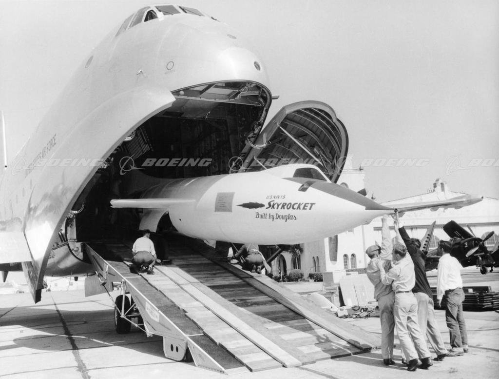 A D-558-2 Skyrocket mock-up with its wings removed is loaded onto a C-124 at the old Los Angeles airport. The mock-up was being transported to participate in an Armed Forces Day open house in 1952.