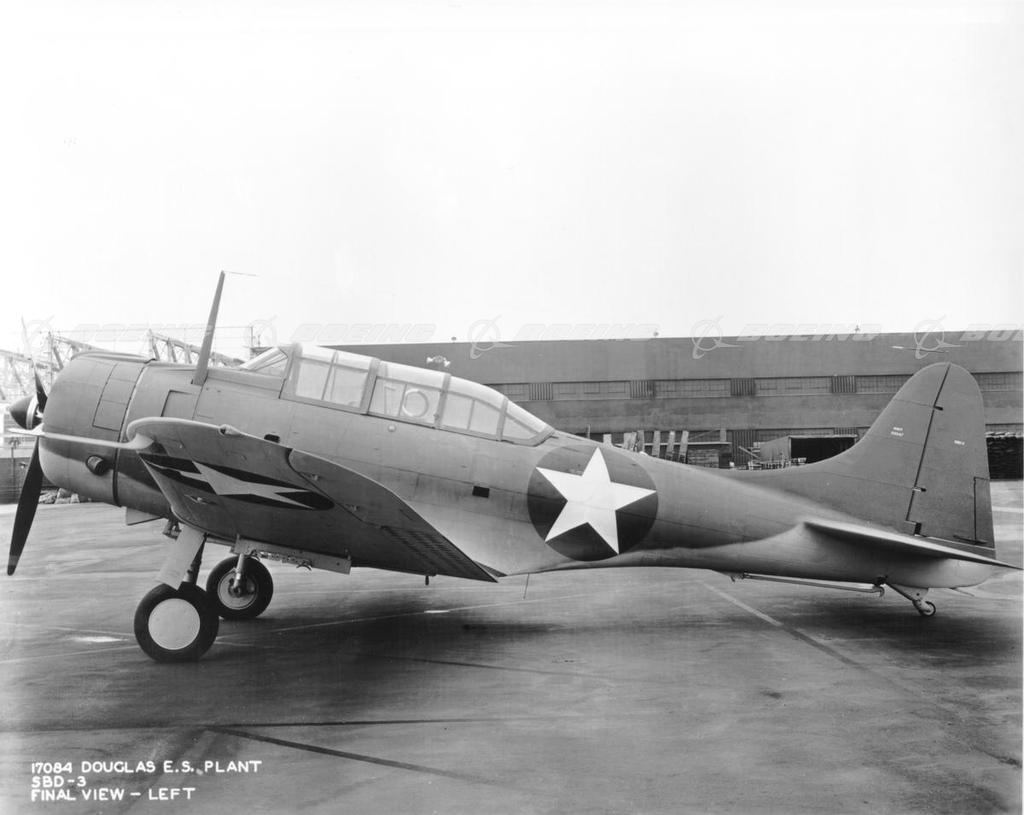 The SBD Dauntless was a two-place, low-wing Navy scout bomber, powered by a single Wright R1820, 1200-horsepower engine. The Dauntless became a mainstay of the Navy's air fleet in the Pacific, with the lowest loss ration of any U.S. carrier aircraft. A total of 5,936 SBDs was delivered between first delivery in 1940 and the end of production in July 1944.