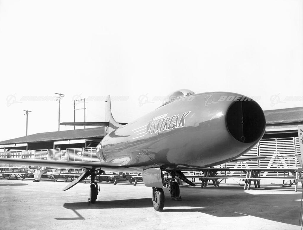 The D-558-1 was developed by the Douglas Aircraft Company at its El Segundo (California) Division in the 1940s. The basic design philosophy was to build the smallest plane around the most powerful turbine engine available. To mitigate as much risk as possible, the team kept the design simple, using a conventional straight wing rather than the then new, and mostly unproven swept wing. The 5,000-lb.-thrust (22-kilonewton) Allison J35-A-11 engine filled the fuselage, leaving just enough room to house instrumentation and a pilot in a cramped cockpit. Because of the lack of knowledge about the survivability of a high-altitude, highspeed bailout, Douglas engineers designed a jettisonable nose section that could protect the pilot until a safe bailout speed was reached.