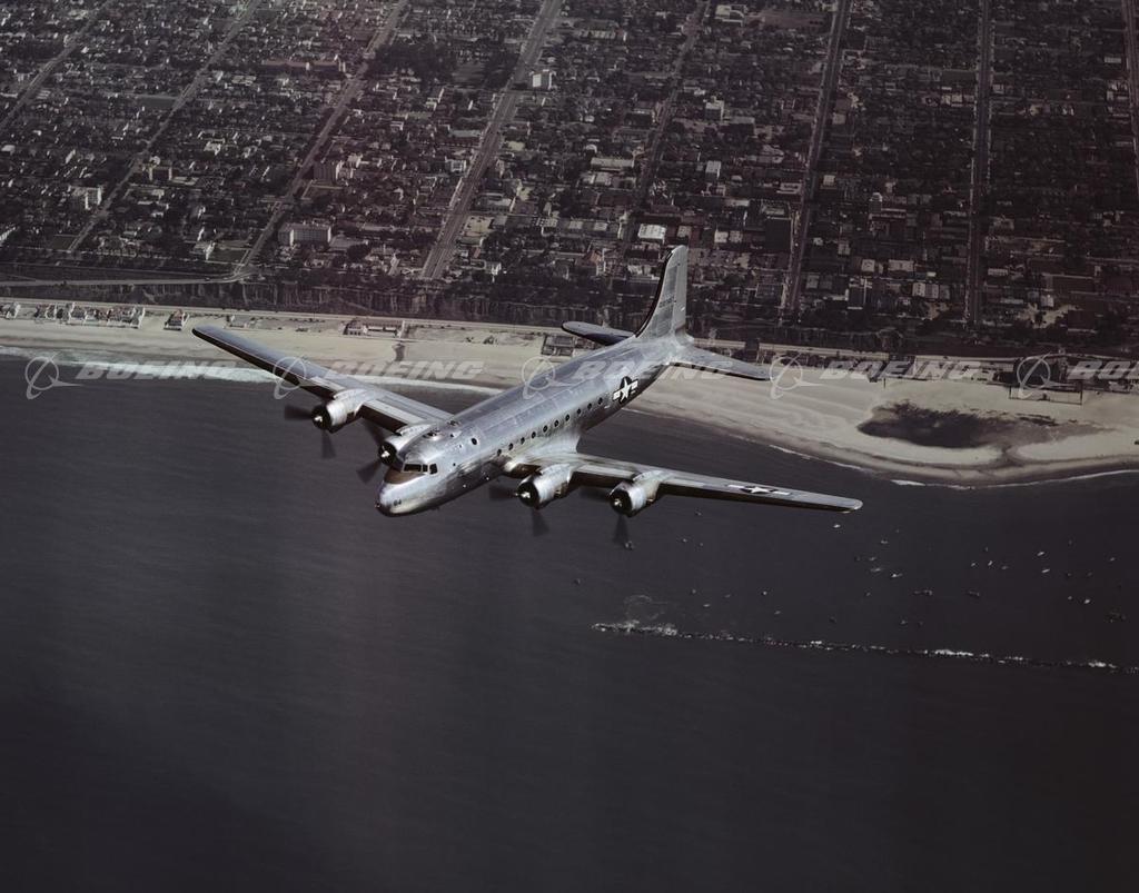 Douglas C-54 Skymaster (1942-1946): America's entry into World War II resulted in the U.S. Army taking over commercial DC-4 production before the first airliner could be completed. The plane made its first flight in February 1942 under the army designation C-54 Skymaster. Modifications to the original design included extra fuel tanks, a reinforced fuselage floor and the addition of side-by-side cargo doors. The C-54 could accommodate 50 troops with combat equipment, or carry 15,000 pounds of cargo on pallets, or airlift 30 patients on stretchers. The C-54 was known in the Navy as the R5D. Between 1942 and 1945, C-54s flew more than 20 round trips a day over the rugged North Atlantic. A single C-54C, nicknamed Sacred Cow, was built as the first official presidential aircraft. When the last C-54 was delivered in January 1946, Douglas had built 1,165 Skymasters. After the war C-54s gained fame as the principle transport used during the 1948-1949 Berlin Airlift.