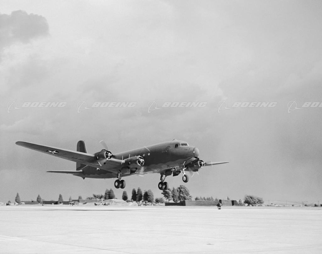 Douglas C-54 Skymaster (1942-1946): America's entry into World War II resulted in the U.S. Army taking over commercial DC-4 production before the first airliner could be completed. The plane made its first flight in February 1942 under the army designation C-54 Skymaster. Modifications to the original design included extra fuel tanks, a reinforced fuselage floor and the addition of side-by-side cargo doors. The C-54 could accommodate 50 troops with combat equipment, or carry 15,000 pounds of cargo on pallets, or airlift 30 patients on stretchers. The C-54 was known in the Navy as the R5D. Between 1942 and 1945, C-54s flew more than 20 round trips a day over the rugged North Atlantic. A single C-54C, nicknamed Sacred Cow, was built as the first official presidential aircraft. When the last C-54 was delivered in January 1946, Douglas had built 1,165 Skymasters. After the war C-54s gained fame as the principle transport used during the 1948-1949 Berlin Airlift.