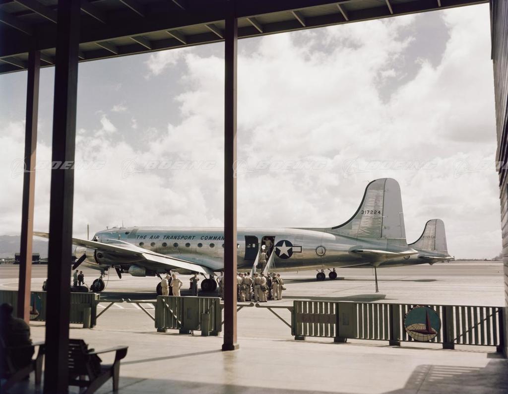 Douglas C-54 Skymaster (1942-1946): America's entry into World War II resulted in the U.S. Army taking over commercial DC-4 production before the first airliner could be completed. The plane made its first flight in February 1942 under the army designation C-54 Skymaster. Modifications to the original design included extra fuel tanks, a reinforced fuselage floor and the addition of side-by-side cargo doors. The C-54 could accommodate 50 troops with combat equipment, or carry 15,000 pounds of cargo on pallets, or airlift 30 patients on stretchers. The C-54 was known in the Navy as the R5D. Between 1942 and 1945, C-54s flew more than 20 round trips a day over the rugged North Atlantic. A single C-54C, nicknamed Sacred Cow, was built as the first official presidential aircraft. When the last C-54 was delivered in January 1946, Douglas had built 1,165 Skymasters. After the war C-54s gained fame as the principle transport used during the 1948-1949 Berlin Airlift.