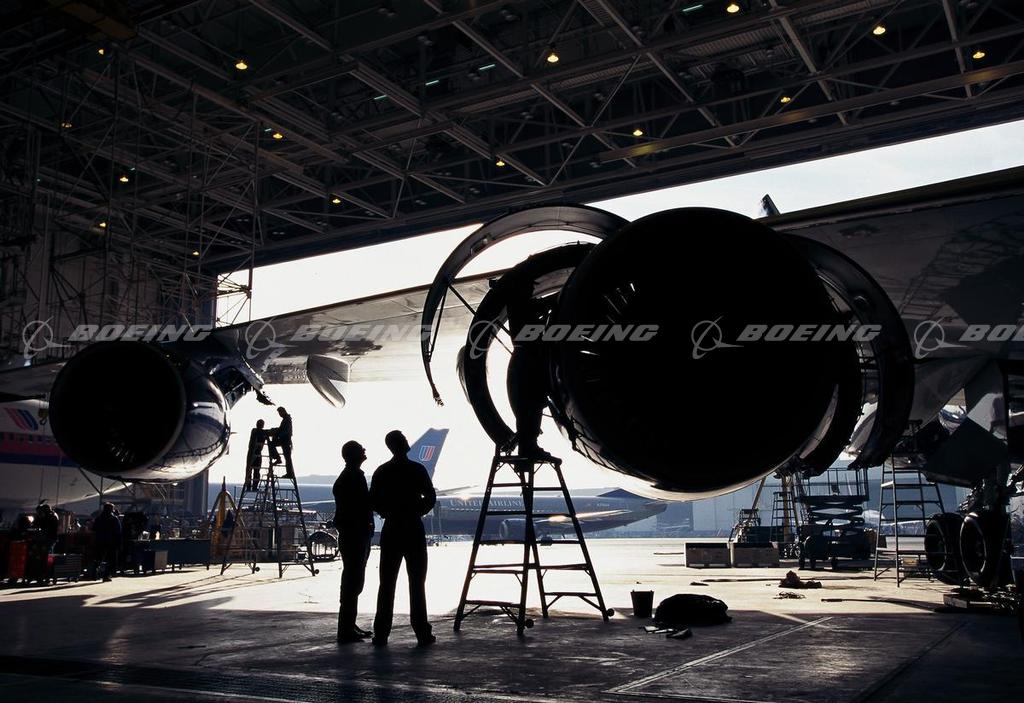 Silhouetted 747 Jet Engine Maintenance Crew at Sunset