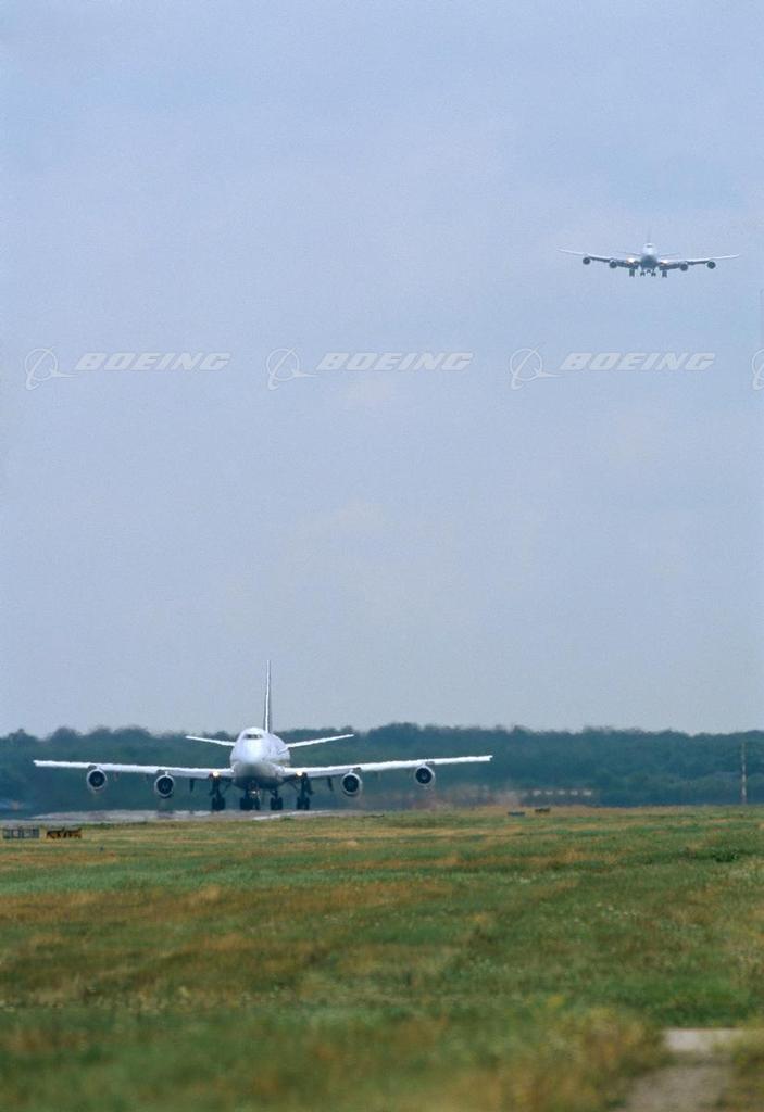 747 Taxiing on Runway in Front of a 747 Coming in for Landing