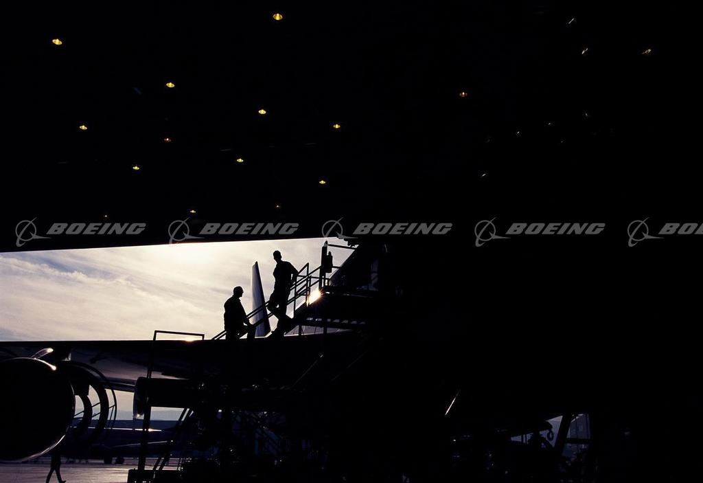 Silhouetted 747 Jet Engine Maintenance Crew at Sunset