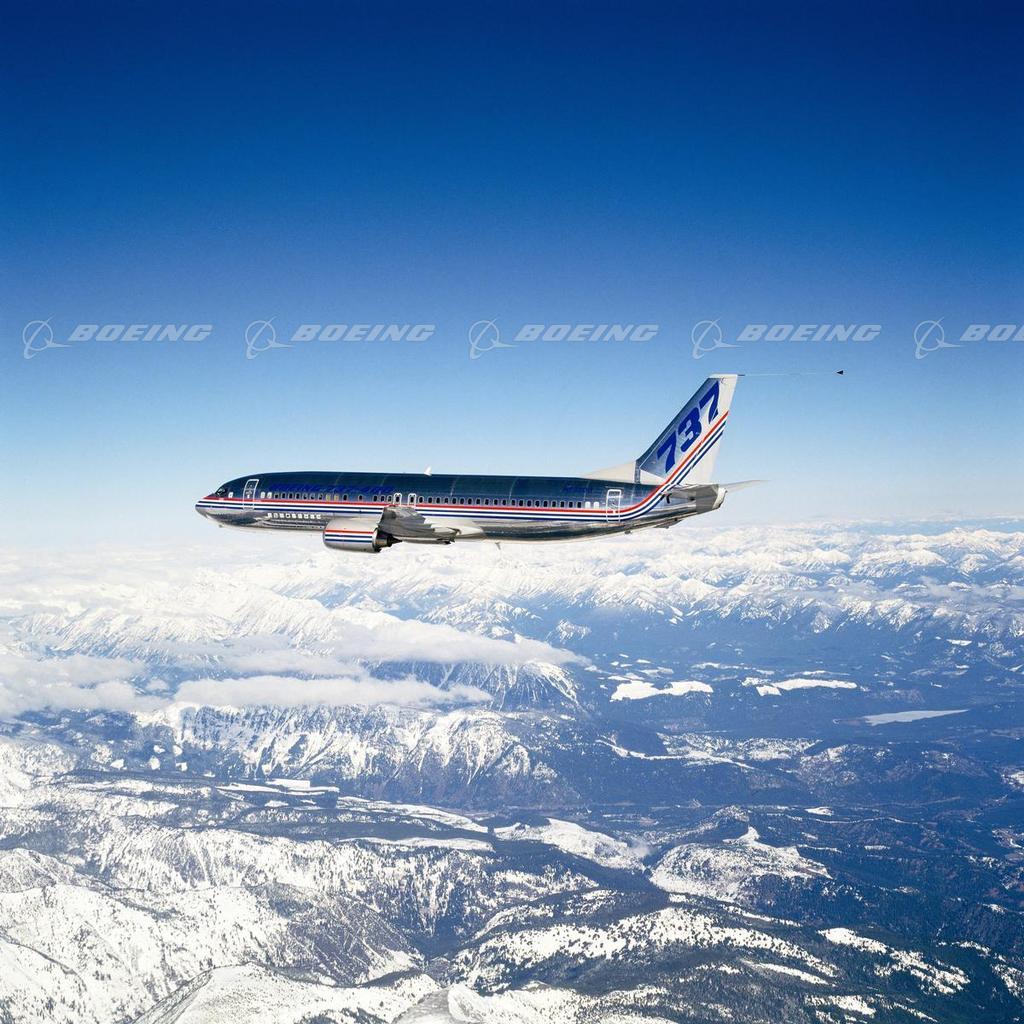 737-300 in Flight Above Snow-Topped Mountains