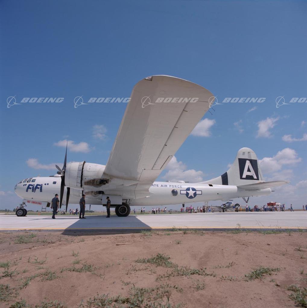 The Boeing B-29, the most technologically advanced airplane produced during World War II, first flew Sept. 21, 1942. At 105,000 pounds, it was the world's heaviest production airplane. It was the first bomber with crew-cabin pressurization and remotely controlled power turrets. A total of 3,970 B-29s were built, with improvements added to the bombers as they went through the production line as data came in from pilots in action. World War II ended when two B-29s, the Enola Gay and Bockscar dropped atomic bombs on Hiroshima and Nagasaki.