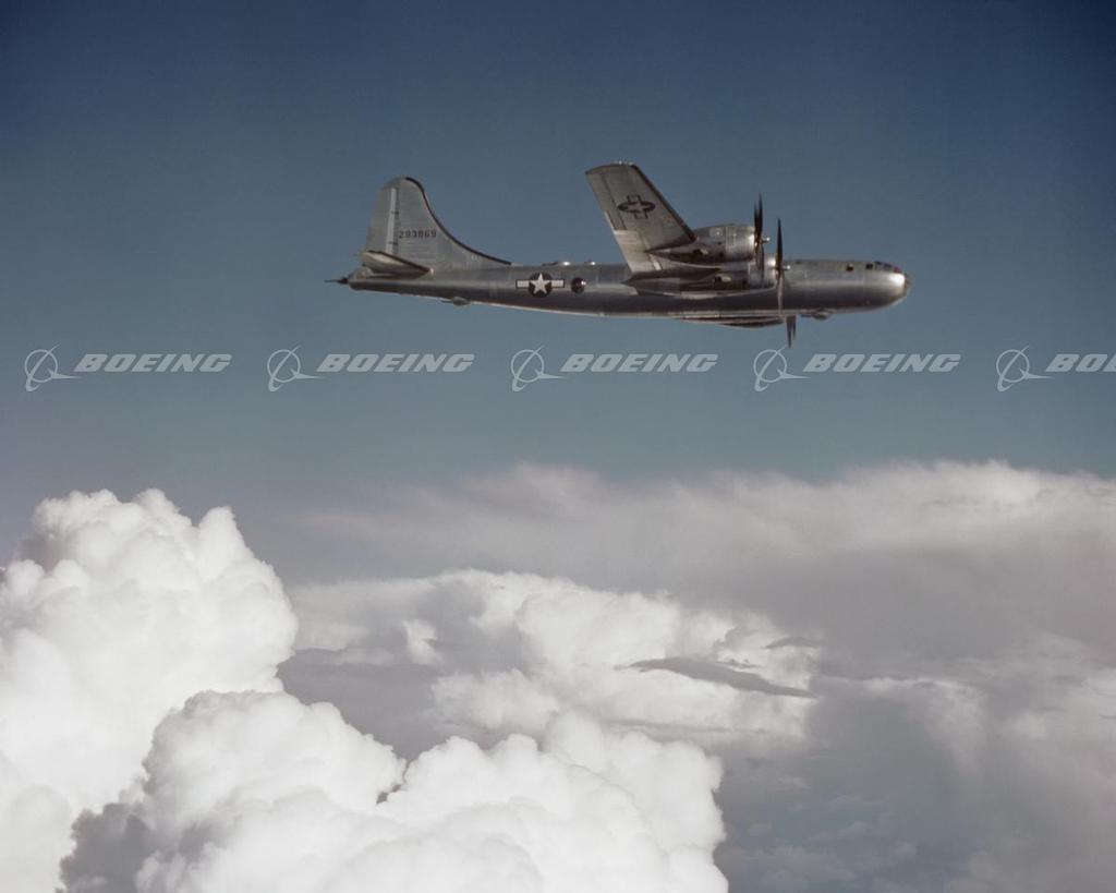 The Boeing B-29 Superfortress, the most technologically advanced airplane produced during World War II, first flew Sept. 21, 1942. The B-29 had many new features, including guns that could be fired by remote control. The crew areas were pressurized and connected by a long tube over the bomb bays. The tail gunner had a separate pressurized area that could only be left during unpressurized flight. At 105,000 pounds, the B-29 was also the heaviest production plane because of increases in range, bomb load and defensive requirements. The B-29 used the high-speed Boeing 117 airfoil, and its larger Fowler flaps added to the wing area as they increased lift. Modifications led to the B-29D, upgraded to the B-50, and the RB-29 photo reconnaissance aircraft. The Soviet-built copy of the B-29 was called the Tupolev Tu-4. A total of 3,970 B-29s were built.