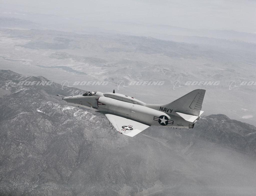 Douglas A-4 Skyhawk (1954-1979): Another successful attack aircraft from the Ed Heinemann team at Douglas was the A-4 Skyhawk. Designed for carrier operations, the Skyhawk was America’s smallest combat jet. Known as “Heinemann’s Hot Rod,” “Scooter,” and the “Mighty Midget,” it reversed the trend toward bigger and more complex aircraft in favor of durability and reliability. The A-4D first flew on June 22, 1954, demonstrating combinations of high performance and lightweight, with speed and maneuverability never before seen in an attack jet. After 1962, the joint service designation was changed to A-4. Behind the AD Skyraider, the A-4 Skyhawk was the most numerous postwar combat aircraft built by Douglas. During its long service career, the U.S. Navy and Marine Corps and the air arms of six other nations flew the A-4 The Skyhawk saw combat in Vietnam, the Middle East, the Falkland Islands, and the Persian Gulf. For 12 years, from 1974 to 1986, the A-4 Skyhawk served with the Navy’s Blue Angels flight demonstration team. In 1979, twenty-five years after its first flight, the last of 2,960 A-4s was delivered. Two-seat trainer versions included the TA-4F, TA-4J and the TA-4K Series. In addition to its primary role as a jet trainer, the TA-4 retained the A-4’s combat capabilities with bombs, rockets, missiles and guns. The TA-4 series had a slightly longer fuselage but carried less internal fuel than the A-4 attack bomber series. The first of the A-4 jet trainer series was delivered to the U.S. Navy in February 1966. A total of 555 TA-4 jet trainers were built. An additional 23 TA-4s were modified from A-4 airframes.