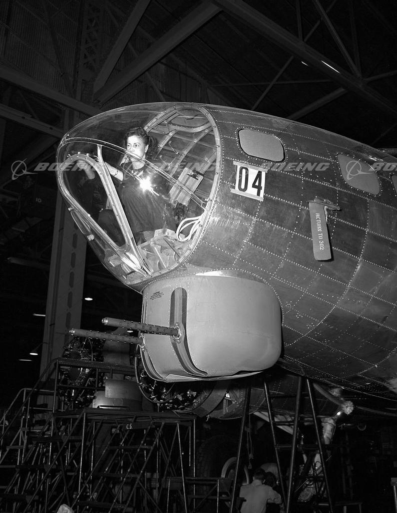 Woman Aligning B-17 Flying Fortress Top Turret Guns