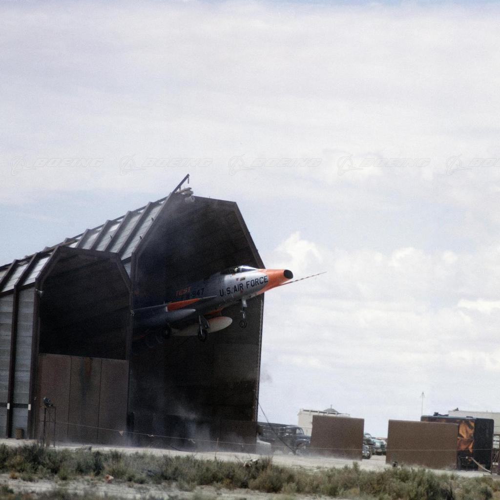 North American Aviation's F-100 Super Sabre first flew May 25, 1953, and was the first operational fighter in the world capable of maintaining supersonic speed in level flight. Of the 2,290 Super Sabres, 1,274 F-100Ds included the first autopilot designed for a supersonic jet. The F-100 had a service ceiling above 50,000 feet and a range of more than 1,000 statute miles.To demonstrate the ability of its pilots and aircraft, the Air Force chose F-100 Super Sabres to perform throughout the world in aerial precision demonstration flights. The famed Thunderbirds, a four-man aircraft team, were viewed by over 19 million people as the storied pilots performed intricate precision maneuvers at low altitude. In Europe the Skyblazers flew similar demonstrations.
