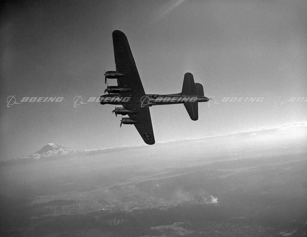 In response for the Army’s request for a large, multiengine bomber, the B-17 (Model 299) prototype, financed entirely by Boeing, went from design to flight test in less than 12 months. The B-17 Flying Fortress was a low-wing monoplane that combined aerodynamic features of the XB-15 giant bomber, and the Model 247 transport. The B-17 was the first Boeing military aircraft with a flight deck instead of an open cockpit and was armed with bombs and five .30-caliber machine guns mounted in clear blisters. Each version of the B-17 was more heavily armed. Described by General H. H. Hap Arnold, as the backbone of our worldwide aerial offensive, the B-17 Flying Fortress served in every World War II combat zone. Boeing, Douglas, and Lockheed Vega produced 12,731 B-17s, and the four-engine bombers became legendary for their ability to stay in the air after taking brutal poundings.