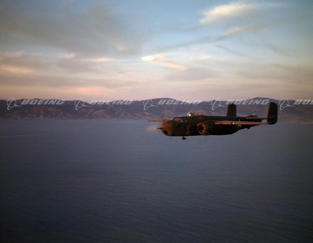 Named after General 'Billy' Mitchell, America's foremost supporter of air power, the B-25 Mitchell first flew on Aug. 19, 1940, and was the first multiengine design to go beyond the prototype stage. North American Aviation built more than 11,000 B-25s for the U.S. Army Air Forces and the U.S. Navy, which called it the PBJ, plus 50 each for China and Great Britain. The B-25 bomber had a wingspan of 67 feet and was 52 feet 11 inches long. One version, the B-25H, was the most heavily armed attack bomber of its time, with a 75-millimeter gun, up to 14 .50 caliber machine guns and 5,000 pounds of bombs carried in an internal bomb bay.