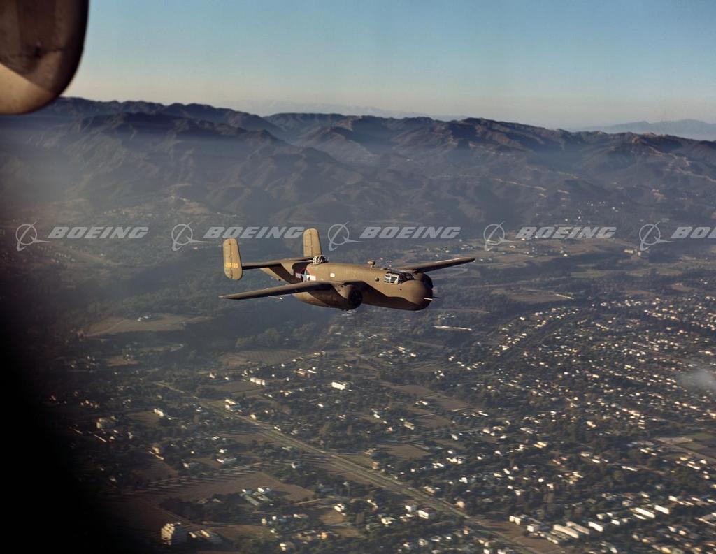 Named after General 'Billy' Mitchell, America's foremost supporter of air power, the B-25 Mitchell first flew on Aug. 19, 1940, and was the first multiengine design to go beyond the prototype stage. North American Aviation built more than 11,000 B-25s for the U.S. Army Air Forces and the U.S. Navy, which called it the PBJ, plus 50 each for China and Great Britain. The B-25 bomber had a wingspan of 67 feet and was 52 feet 11 inches long. One version, the B-25H, was the most heavily armed attack bomber of its time, with a 75-millimeter gun, up to 14 .50 caliber machine guns and 5,000 pounds of bombs carried in an internal bomb bay.