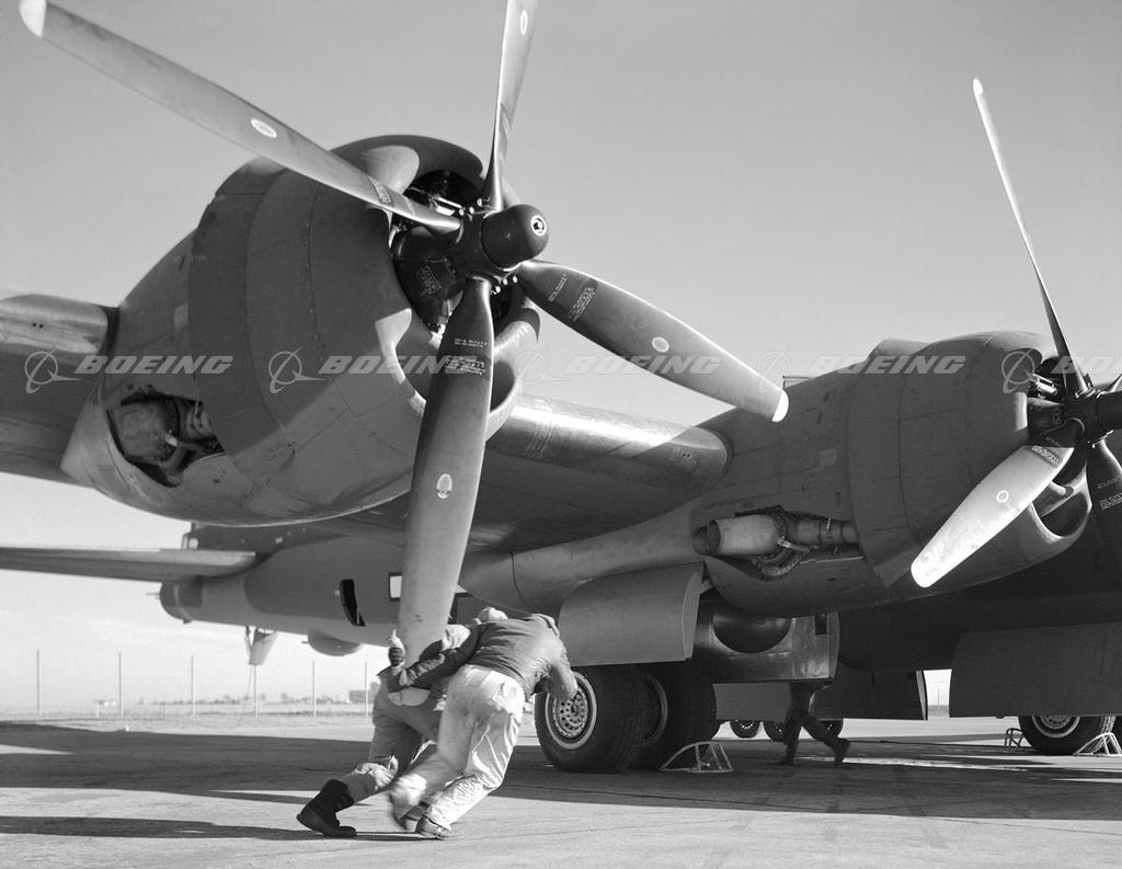 Mechanic Servicing a B-29 Superfortress, Dwarfed by Propeller