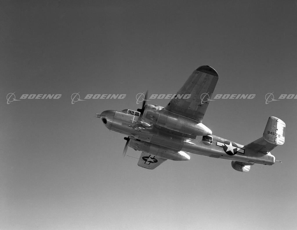 Named after General 'Billy' Mitchell, America's foremost supporter of air power, the B-25 Mitchell first flew on Aug. 19, 1940, and was the first multiengine design to go beyond the prototype stage. North American Aviation built more than 11,000 B-25s for the U.S. Army Air Forces and the U.S. Navy, which called it the PBJ, plus 50 each for China and Great Britain. The B-25 bomber had a wingspan of 67 feet and was 52 feet 11 inches long. One version, the B-25H, was the most heavily armed attack bomber of its time, with a 75-millimeter gun, up to 14 .50 caliber machine guns and 5,000 pounds of bombs carried in an internal bomb bay.