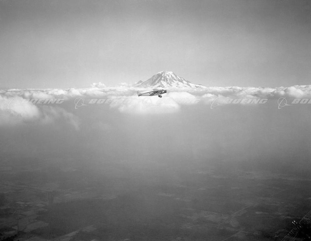 Model 80A in Flight over Clouds, in Front of Mt. Rainier