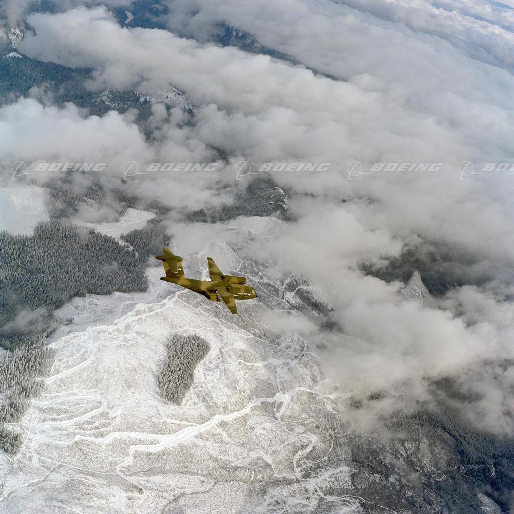 Camouflaged YC-14 in Flight Above Mt. Rainier