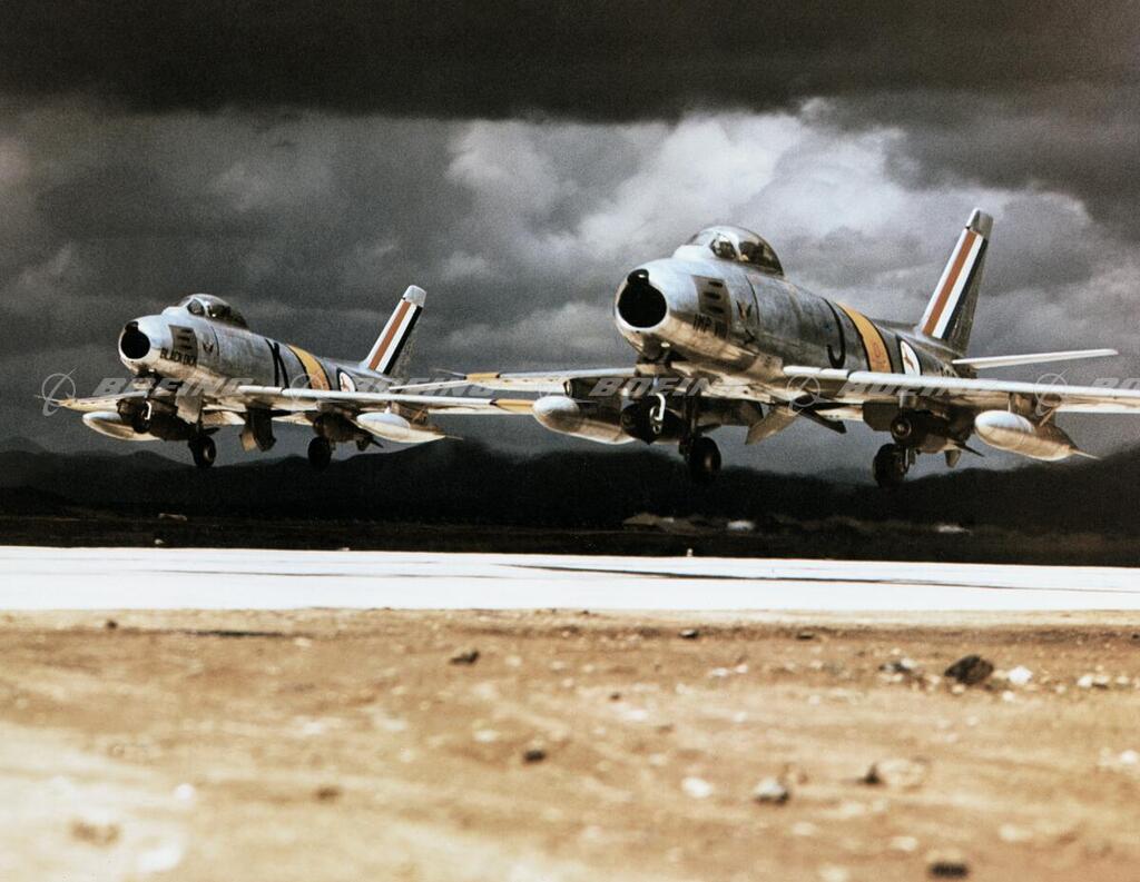 The North American F-86 Sabre Jet made its first flight Oct. 1, 1947, and was America’s first single-seat, swept-wing jet fighter. In 1948, it set a new world speed record of 671 mph, and it was the world’s first-line fighter for more than a decade after it was designed. More than 6,000 Sabre Jets were built worldwide. During the Korean conflict, the Sabre Jet flew 82,177 sorties during 32 months of combat and troop support. Four models of the craft (F-86A, E, F and H) were day fighters or fighter bombers, while the F-86D, K and L versions were all-weather interceptors and sported black radome noses, replacing the yawning jet intakes of the other models. The version built for the U.S. Navy and Marine Corps was called the FJ-2 Fury.