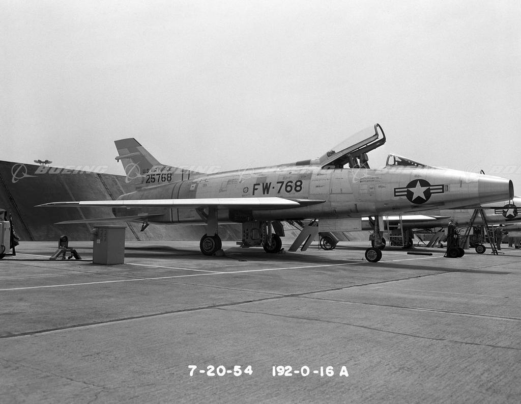 The F-100 Super Sabre was a sleek, swept-back-wing fighter that gave the United States a supersonic Air Force. Since May 1953, when the first prototype model, the YF-100, bettered the speed of sound on its first flight, the versatile fighter set numerous records for speed, endurance, range and maintenance. Late production models of the F-100D and F-100F had the capability of being launched from remote areas in the manner of manned missiles. Of the 2,290 Super Sabres produced, 1,274 F-100Ds included the first autopilot designed for a supersonic jet. Powered by a 16,950-pound-thrust afterburning jet engine, the F-100 was armed with four 20-millimeter cannons, two GAM 83A Bulldog missiles, four Sidewinder missiles, rockets, special stores, and/or 7,040 pounds of bombs.To demonstrate the ability of its pilot and aircraft, the Air Force chose F-100 Super Sabres to perform throughout the world in aerial precision demonstration flights. The famed Thunderbirds, a four-man aircraft team, were viewed by over 19 million people as the storied pilots performed intricate precision maneuvers at low altitude.