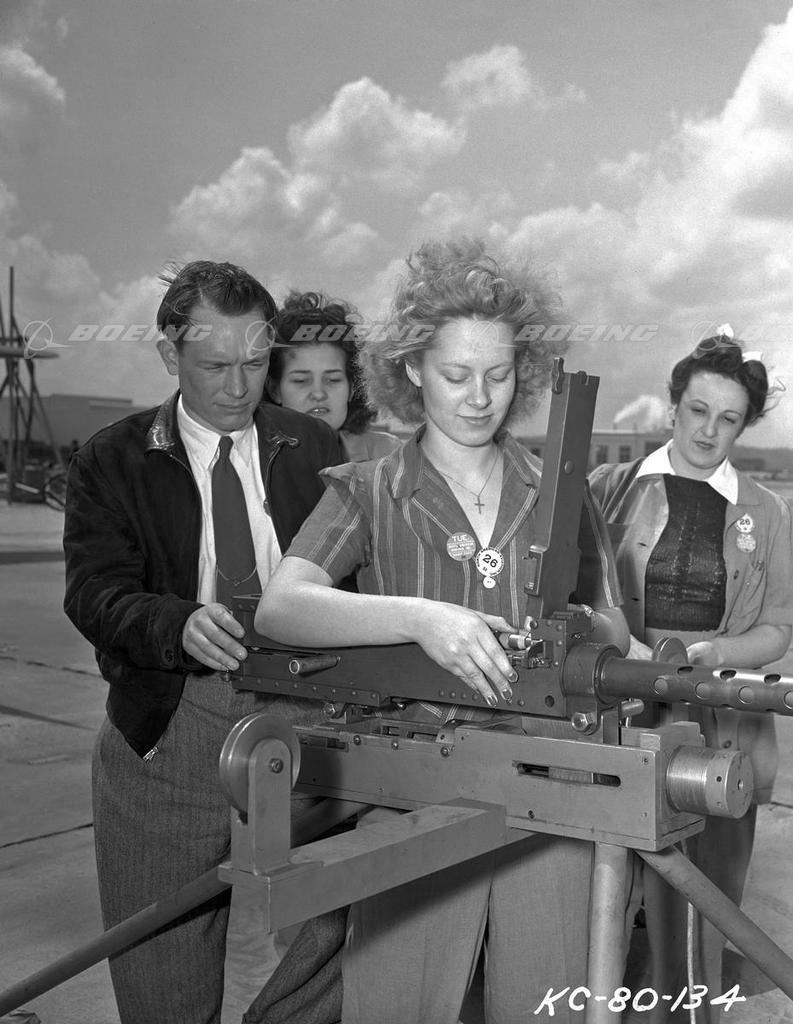 Woman Aligning B-17 Flying Fortress Top Turret Guns