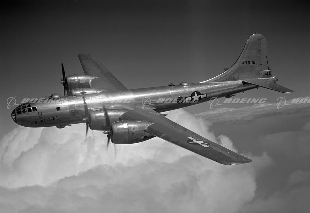 The Boeing B-29 Superfortress, the most technologically advanced airplane produced during World War II, first flew Sept. 21, 1942. The B-29 had many new features, including guns that could be fired by remote control. The crew areas were pressurized and connected by a long tube over the bomb bays. The tail gunner had a separate pressurized area that could only be left during unpressurized flight. At 105,000 pounds, the B-29 was also the heaviest production plane because of increases in range, bomb load and defensive requirements. The B-29 used the high-speed Boeing 117 airfoil, and its larger Fowler flaps added to the wing area as they increased lift. Modifications led to the B-29D, upgraded to the B-50, and the RB-29 photo reconnaissance aircraft. The Soviet-built copy of the B-29 was called the Tupolev Tu-4. A total of 3,970 B-29s were built.