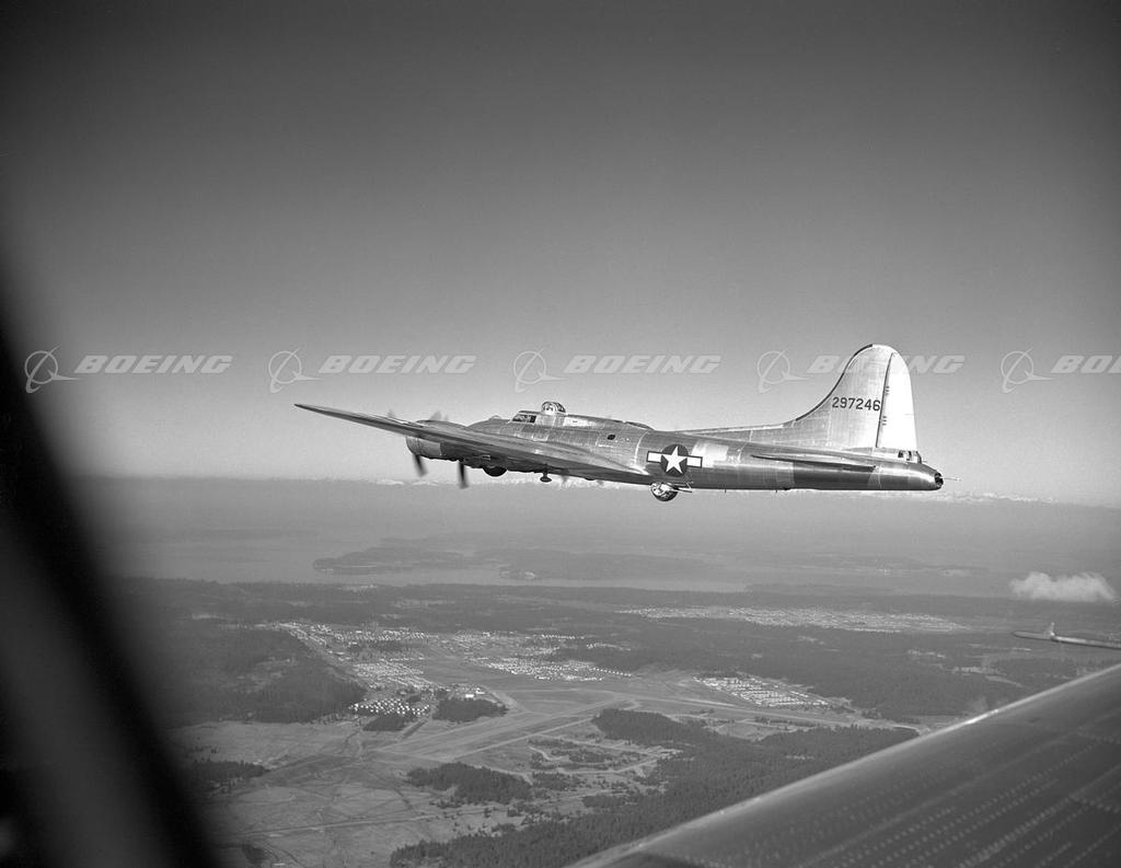 In response for the Army’s request for a large, multiengine bomber, the B-17 (Model 299) prototype, financed entirely by Boeing, went from design board to flight test in less than 12 months. The B-17 was a low-wing monoplane that combined aerodynamic features of the XB-17 giant bomber, still in the design stage, and the Model 247 transport. The B-17 was the first Boeing military aircraft with a flight deck instead of an open cockpit and was armed with bombs and five .30-caliber machine guns mounted in clear blisters. The B-17E, the first mass-produced model Flying Fortress, carried nine machine guns and a 4,000-pound bomb load. It was several tons heavier than the prototypes and bristled with armament. It was the first Boeing airplane with the distinctive - and enormous - tail for improved control and stability during high-altitude bombing. Each version was more heavily armed. In the Pacific, the planes earned a deadly reputation with the Japanese, who dubbed them four-engine fighters. The Fortresses were also legendary for their ability to stay in the air after taking brutal poundings. They sometimes limped back to their bases with large chunks of the fuselage shot off.